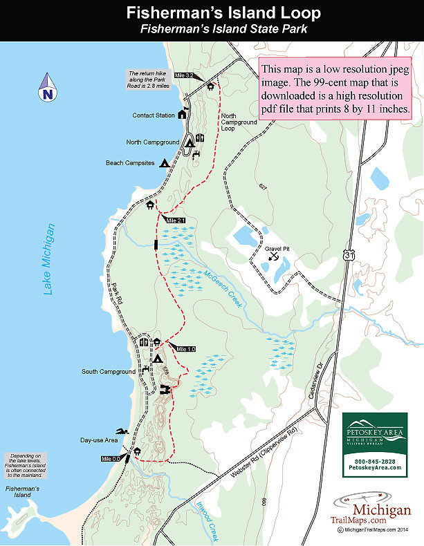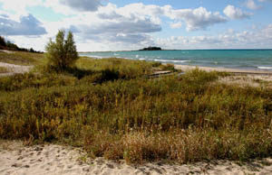 The road ends at the park’s day-use area where from the beach there is a view of Fisherman’s Island. Only it’s not an island anymore due to the lower lake levels in recent years. Now you can hike out to the islet, to search for Petoskey Stones if you want, and never have to worry about getting your feet wet. The state park also features 81 rustic campsites, including a dozen overlooking Lake Michigan and 3.5 miles of designated trails.