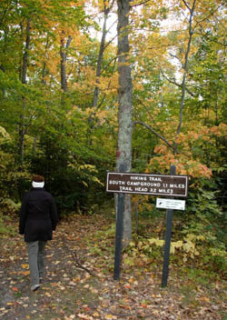 The lightly-used trails form a pair of inter-connecting semi-loops through the undeveloped interior of the park. Away from the shoreline, the park's terrain is made up of rolling "old dunes" covered with secondary growth maple, birch and aspen forest and broken up by bogs of cedar and black spruce. The upper portion of the system is often referred to as North Campground Loop and is open to mountain biking. The lower South Campground Loop is closed to off-road cycling. Together, along with a connector between them, the loops form a 3.2-mile hike from the day-use area to a trailhead along Bell’s Bay Road just east of the park entrance. Hiking back to your vehicle along the Park Road makes for a very scenic return and a 6-mile trek, the one described below.