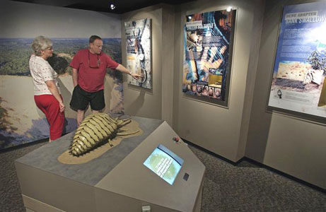 The center features a hall entitled “Michigan Coastal Sand Dunes Like Nowhere Else on Earth” in which dioramas depict the four dune habitats, including models of the animals, plants, trees, even the sounds of waves and birds in the background. Nearby is an animation station that shows how sand dunes are formed. There is also an 82-seat theater that uses a nine-projector, multi-image slide show to explain further the dunes’ delicate nature and the reason the state has moved to protect them from over development.