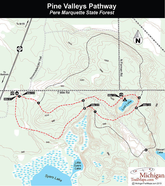 Located 13 miles north of Baldwin, the pathway is a system of three interconnected loops that total 8.2 miles. The southern loop was heavily clear cut in the late 1980s and today still resembles a match stick forest of aspen. The northern loop is bisected by two-tracks, snowmobile routes and the Little Manistee Trail used by ORVs. Mountain bikers often choose to follow the premiere of the system for the most mileage possible, a ride of 6.1 miles.
