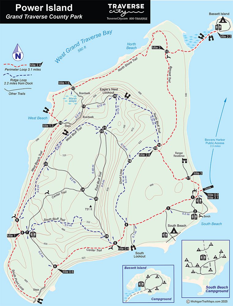 One of Michigan's most unusual county parks is Power Island. The 204-acre preserve of forests, bluffs, and beaches is 3.5 miles south of Bowers Harbor in West Grand Traverse Bay and in sight of downtown Traverse City. The park actually contains two islands, but during periods of low water levels, adjoining Bassett Island is connected to the much larger Power Island by a narrow isthmus of sandy beaches and wetlands.