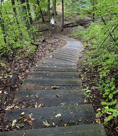 Continue north for Eagle Nest Lookout at Post 20, where, to the dismay of many, there is neither breathtaking scenery nor a nest in sight. But the post marks the junction to the North Bluff Trail, which quickly passes sweeping views of the island’s north end and Bowers Harbor in the distance. The loop is completed by descending to the Short Loop, a wide path that was once part of an interpretive trail.