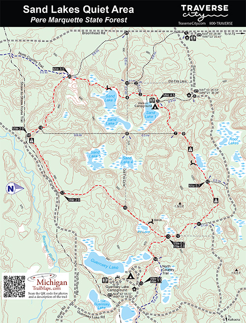 But the most popular trailhead is a parking area at the corner of Broomhead and Sand Lakes roads, four miles south of M-72. Post 1 is located here and the rest follow in a clockwise direction, corresponding to a map produced by the DNR’s Forest Management Division.